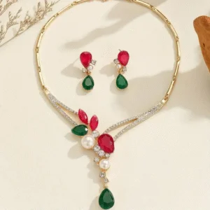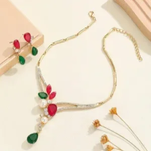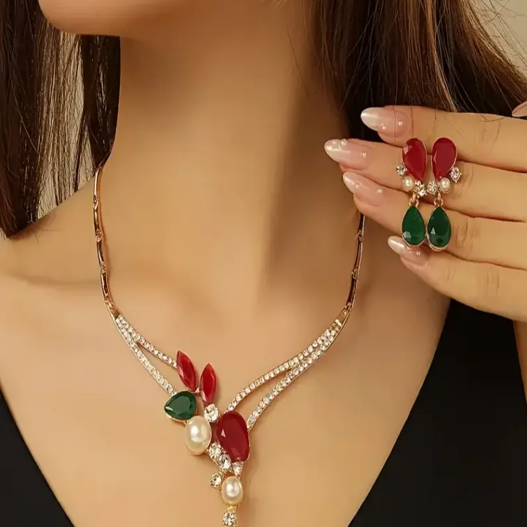 3pcs Vintage Elegant Jewelry Set, Zinc Alloy Necklace with Rhinestone Accents and Stainless Steel Ear Needles, Geometric Red and Green Pendant, for Weddings, Banquets, and Special Occasions (all products free home delivery)
